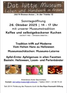 Unsere Mitglieder haben zahlreiche Utensilien aus allen Lebensbereichen zusammengetragen, um Geschichte erlebbar zu machen. Viele Gerätschaften und Werkzeuge, die im „lüttjen Museum“ ausgestellt sind, erinnern an das Arster Alltagsleben in früheren Zeiten.