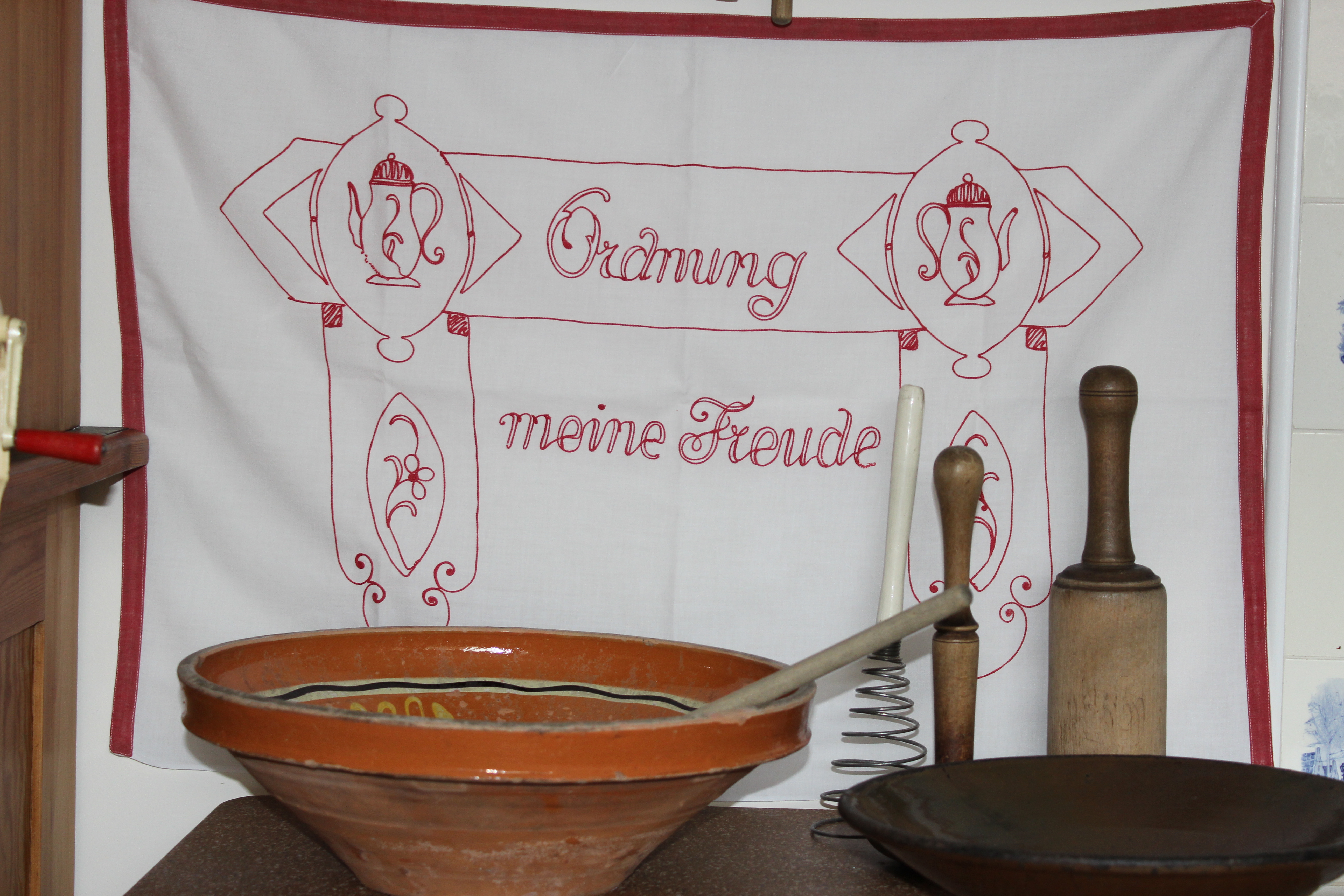 Handarbeiten, insbesondere kunstvoll bestickte und mit verschiedenen Sprüchen versehene Überhandtücher, zieren diesen Ausstellungsraum.